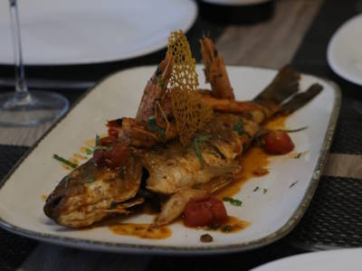 Levrek, karkalec, kallamare, midhje, gaforre, pomodorini.